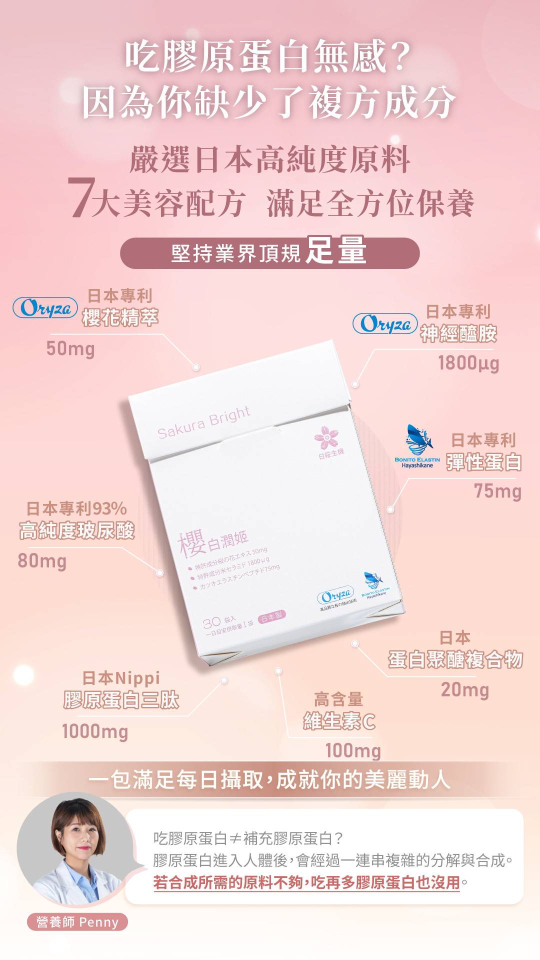 櫻白潤姬,膠原蛋白,養顏美容,玻尿酸,神經醯胺,彈性蛋白,維生素C,美妍,櫻花,美顏保健品,美容保健,日本膠原蛋白,美白,抗老,保濕,日櫻生機,北海道鮭魚精華